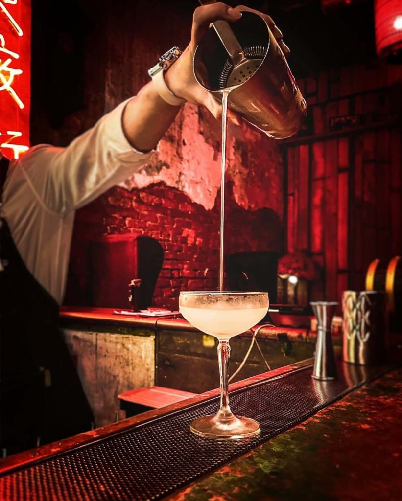 This speakeasy-inspired bar is hidden behind a noodle stall façade, and once you walk through the red curtains, you’re greeted by moody lighting, velvet seats, and dramatic décor.